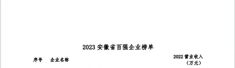 2023年11月22日,安徽省企業(yè)聯(lián)合會(huì)、安徽省企業(yè)家聯(lián)合會(huì)舉辦了2023安徽百?gòu)?qiáng)企業(yè)發(fā)布會(huì)暨企業(yè)家論壇,現(xiàn)場(chǎng)發(fā)布了“2023安徽省百?gòu)?qiáng)企業(yè)”榜單,及“2023安徽省制造業(yè)百?gòu)?qiáng)企業(yè) ”“2023安徽省服務(wù)業(yè)百?gòu)?qiáng)企業(yè)”榜單。該活動(dòng)迄今已經(jīng)連續(xù)開(kāi)展十九屆,基本囊括了安徽營(yíng)收規(guī)模排在前列的各類(lèi)企業(yè)。