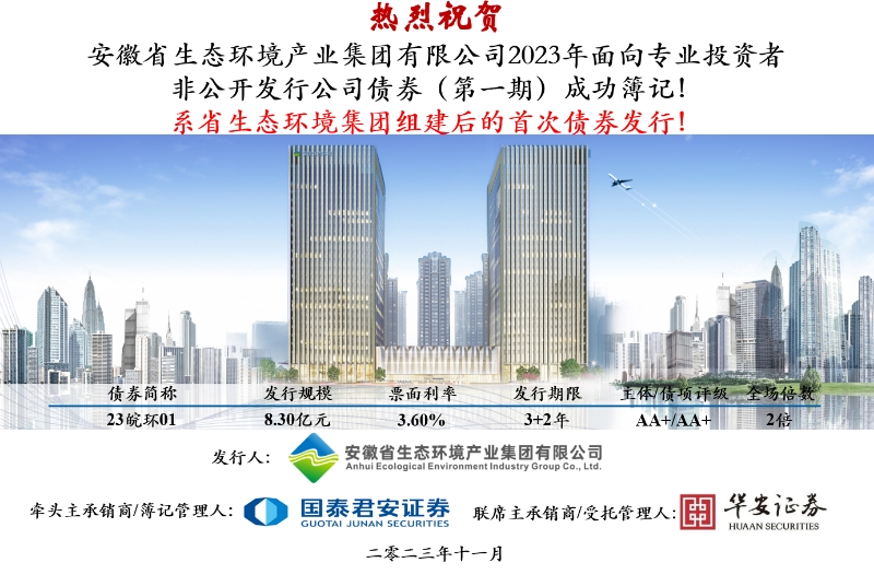 11月24日,省生態(tài)環(huán)境集團(tuán)首單非公開(kāi)公司債券(債券簡(jiǎn)稱(chēng):23皖環(huán)01,債券代碼:253104.SH)在上海證券交易所成功簿記發(fā)行,本次債券由國(guó)泰君安、華安證券主承銷(xiāo),募集金額8.3億元,期限3+2年,票面利率3.60%,圓滿(mǎn)完成集團(tuán)掛牌以后在資本市場(chǎng)的首次亮相。